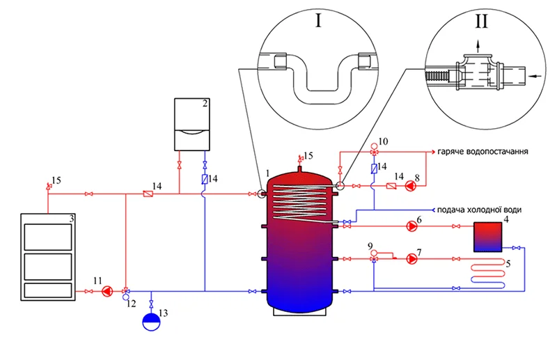 - Універсальність підключення: Сумісність з різними теплогенераторами (котли, теплові насоси, сонячні колектори) та можливість інтеграції електричного ТЕНу.