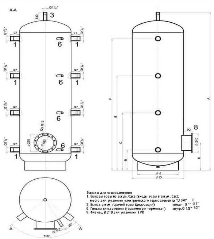 Конструкція ємності передбачає вісім патрубків діаметром 6/4", один патрубок 1" та чотири патрубки 1/2" для гнучкого підключення теплоносія та організації контурів опалення. Також є багатофункціональний фланець з міжцентровою відстанню болтів 210 мм, що дозволяє встановлювати електричні нагрівальні елементи серії TPK або TJ, розширюючи можливості використання ємності. Знімна поліуретанова теплоізоляція товщиною 100 мм, що поставляється окремо, забезпечує мінімальні тепловтрати.