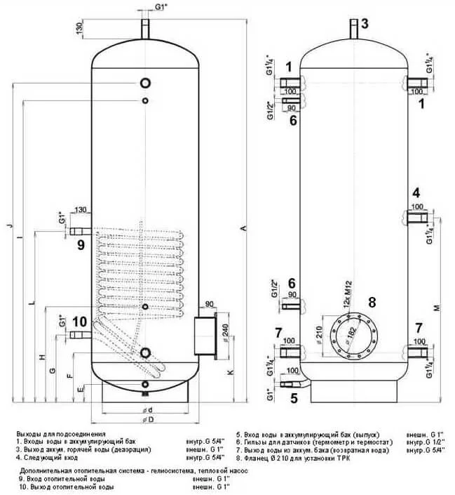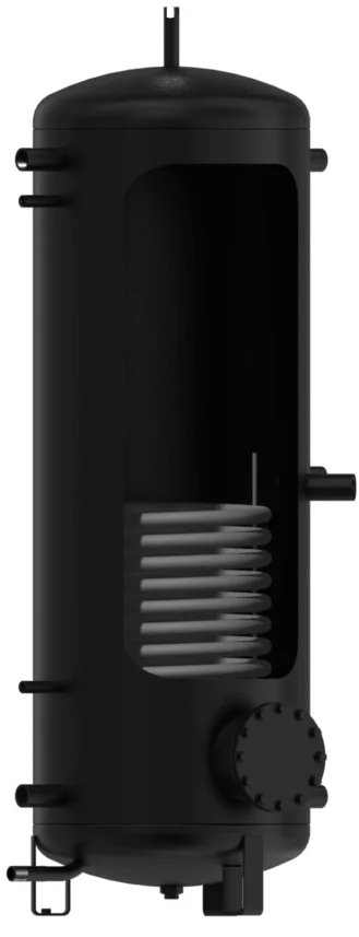 Також передбачена можливість монтажу електричних ТЕНів сумарною потужністю до 21 кВт для додаткового нагріву теплоносія. Бак та теплообмінник виготовлені зі сталі, що забезпечує міцність та довговічність конструкції. Ємність комплектується знімною поліуретановою теплоізоляцією без фреону товщиною 100 мм, яка постачається в окремій упаковці та ефективно мінімізує втрати тепла. Для підключення до системи опалення передбачено п'ять патрубків діаметром 5/4", два патрубки 1" та два патрубки 1/2", що забезпечує гнучкість у конфігурації.