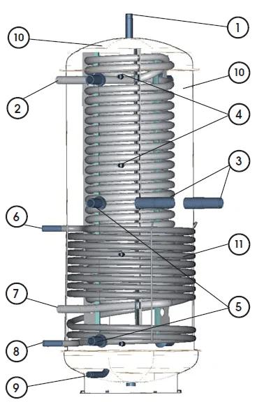 - Можливість підключення ТЕНу: Передбачена можливість встановлення електричного термоелемента TJ 6/4" або нагрівального фланця TPK для додаткового нагріву води.