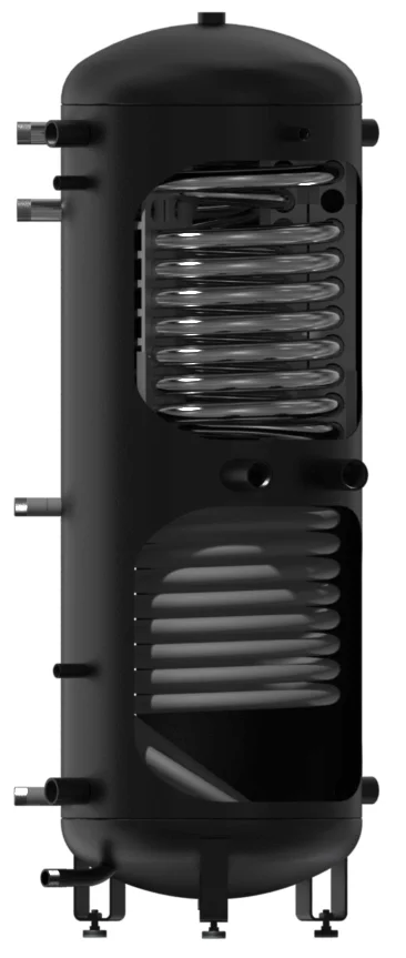 • Багатоджерельне підключення: Два вбудовані теплообмінники дозволяють інтегрувати ємність з різними джерелами тепла, включаючи твердопаливні котли, сонячні колектори та теплові насоси.