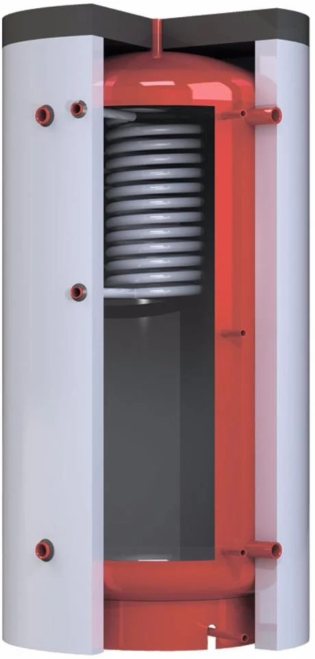 - Розширені можливості підключення: Наявність одного теплообмінника та додаткових патрубків дозволяє інтегрувати ємність у складні системи опалення, підключаючи її до різних джерел тепла або використовуючи як гідравлічний роздільник.