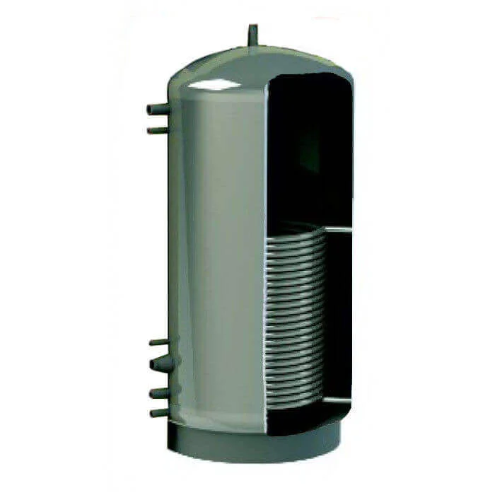 Ємність виконує роль гідравлічної стрілки та може використовуватися як у відкритих, так і в закритих системах опалення, витримуючи тиск теплоносія до 3 бар. Стінки ємності виготовлені з чорного металу без внутрішнього покриття. Модель обладнана нижнім теплообмінником з чорного металу площею 5.7 м² та об'ємом 33 л, спеціально призначеним для підключення сонячних колекторів або інших незалежних джерел нагріву. Термоізоляція товщиною 100 мм з м'якого пінополіуретану, обшита штучною шкірою, мінімізує втрати тепла. Всі з'єднувальні патрубки мають внутрішню різьбу, а також передбачена можливість підключення електричного ТЕНу.