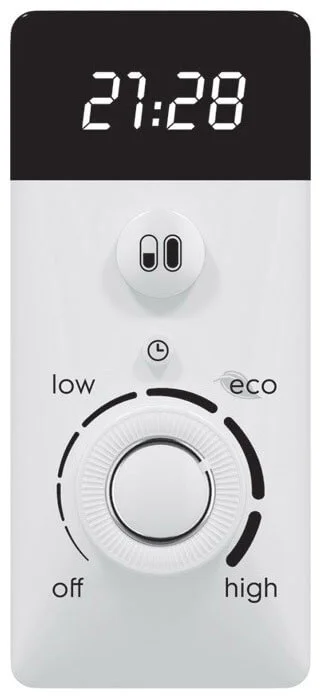 Водонагрівач має пласку форму та працює від мережі 220 В. Електронне керування з дисплеєм дозволяє точно налаштовувати параметри роботи, включаючи вибір одного з трьох режимів потужності. Ступінь захисту від води IPX4 гарантує безпечну експлуатацію в умовах підвищеної вологості.