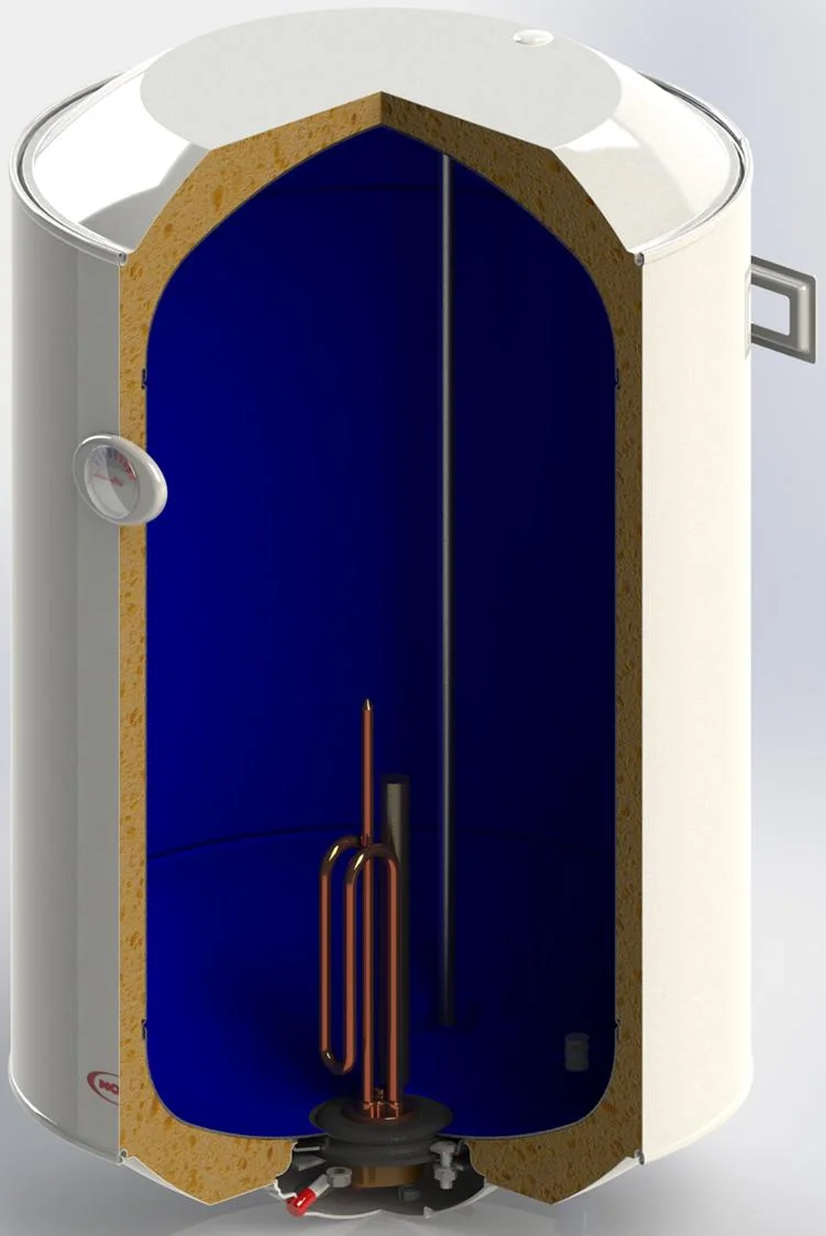 Внутрішній бак бойлера має емалеве покриття, яке захищає його від корозії та забезпечує довговічність. Нагрів води здійснюється за допомогою одного «мокрого» ТЕНа потужністю 1.2 кВт, що забезпечує нагрів до максимальної температури +77 °С за 147 хвилин. Регульований термостат виконує функції управління температурою, автоматичного режиму роботи та безпеки, дозволяючи контролювати витрати електроенергії. Для додаткового захисту від корозії використовується магнієвий протектор. Весь електричний блок, включаючи ТЕН, термостат та магнієвий анод, зібраний на масивному сталевому фланці, що кріпиться до бака п'ятьма болтами.