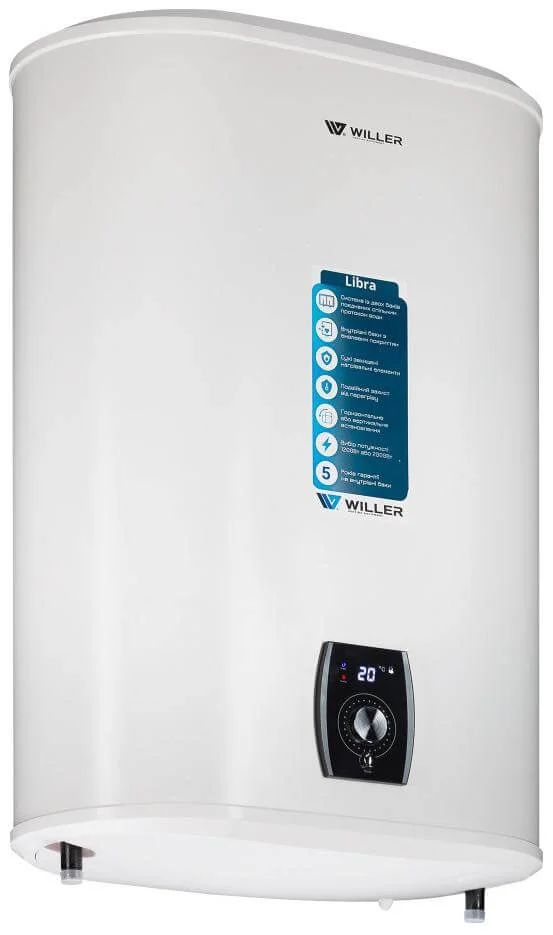 Плоска конструкція водонагрівача Willer EVH30DRI-Libra забезпечує зручність розміщення в обмеженому просторі, дозволяючи як вертикальний, так і горизонтальний монтаж. Модель оснащена електронною панеллю управління з інтегрованим LED-дисплеєм, який відображає поточну температуру води та обраний режим нагріву. Користувач може обирати між двома режимами потужності: 1200 Вт для економного споживання або 2000 Вт для швидшого нагріву.