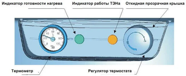 - Зручне керування: Панель керування включає сигнальний індикатор роботи, регулятор температури гарячої води та термометр, що дозволяє легко контролювати та налаштовувати параметри.
