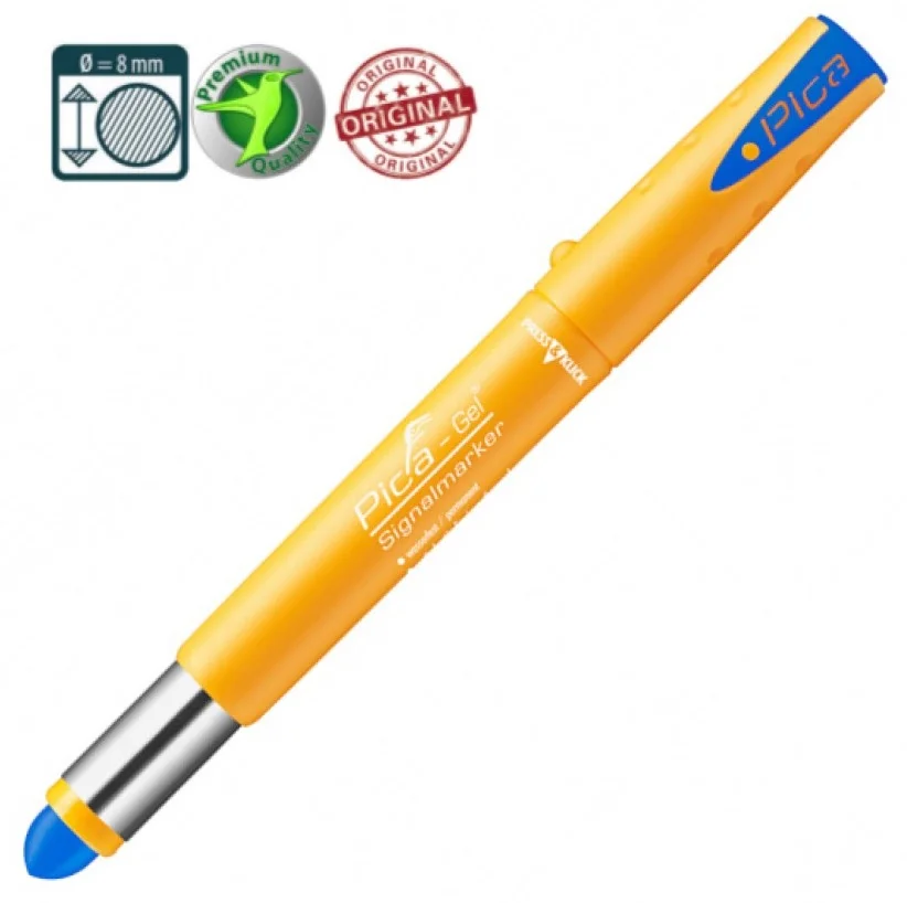 Маркер Pica GEL Signalmarker з гелевим стрижнем діаметром 8 мм призначений для стійкого маркування на різних поверхнях у складних умовах. Він залишає контрастний синій слід, який витримує вплив води, ультрафіолету та високих температур до 1000 °C. Корпус довжиною 160 мм оснащений механізмом подачі стрижня та вбудованою точилкою.