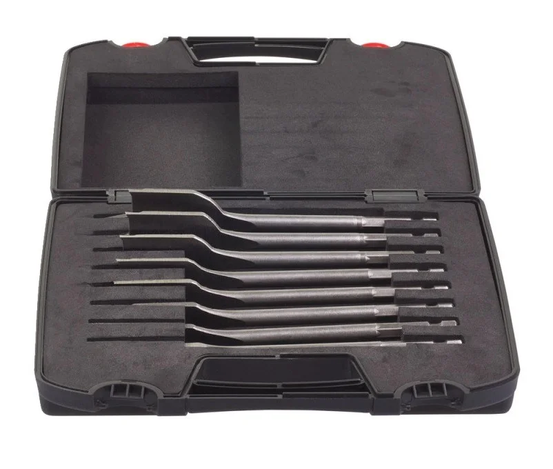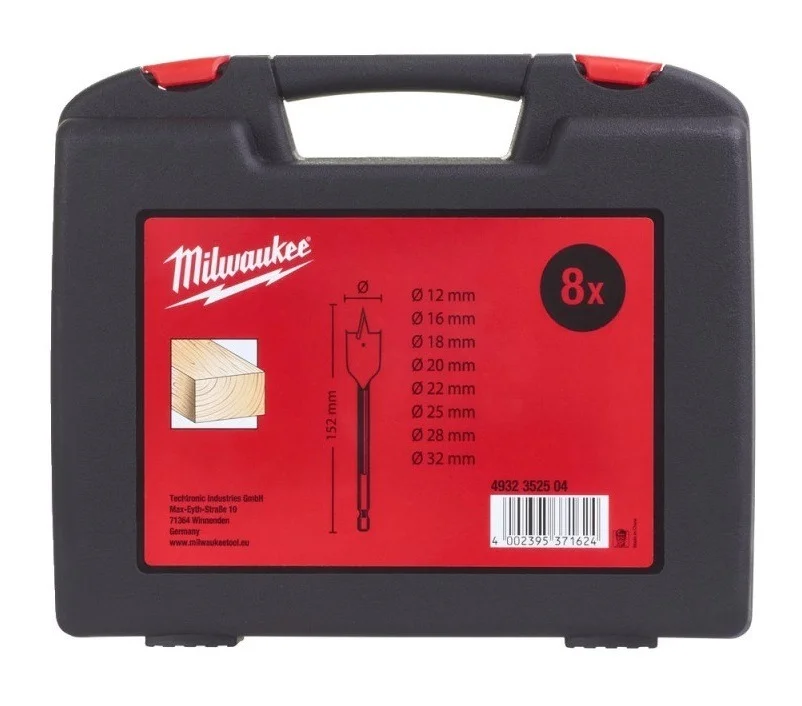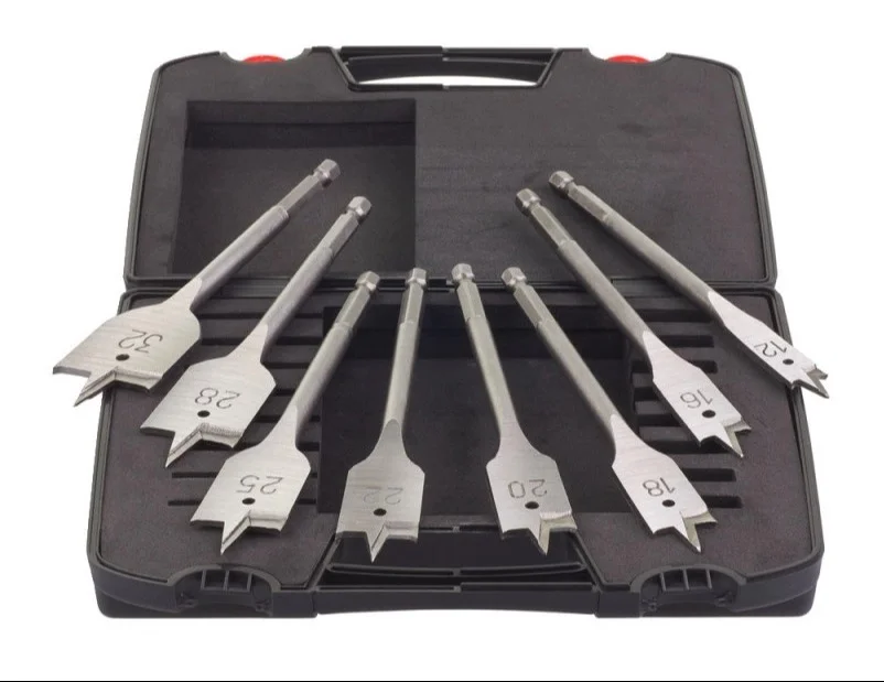 Набір включає вісім пір'яних свердел з діаметрами від 12 до 32 мм, що забезпечує можливість вибору потрібного розміру для створення точних отворів великого діаметра. Інструменти мають шестигранний хвостовик 1/4" для надійної фіксації в патроні або безпосередньо в шпинделі гвинтоверта.
