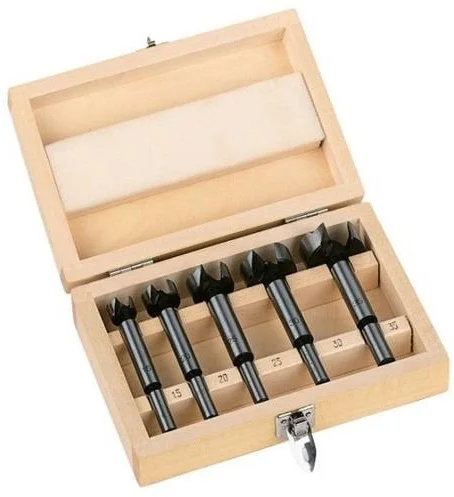 Набір складається з п'ятьох свердел Форстнера діаметром 15, 20, 25, 30 та 35 мм, що дозволяє виконувати отвори різного розміру в деревині. Центральна точка кожного інструмента забезпечує точне позиціонування на матеріалі, а зовнішні ріжучі кромки запобігають утворенню сколів по краях, залишаючи чисту поверхню. Виготовлені за стандартом DIN 74836, свердла мають робочу довжину 50 мм та циліндричний хвостовик діаметром 9.5 мм для надійного затиску в патроні.