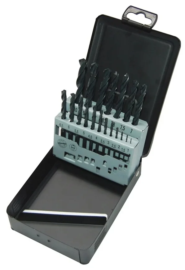 Набір складається з 19 спіральних свердел по металу, виготовлених зі швидкорізальної сталі HSS-R за стандартом DIN 338. Діаметри інструментів у комплекті покривають діапазон від 1.0 до 10.0 мм з кроком, оптимальним для більшості технічних завдань. Усі свердла мають циліндричний хвостовик та кут заточування ріжучої частини 118 градусів.