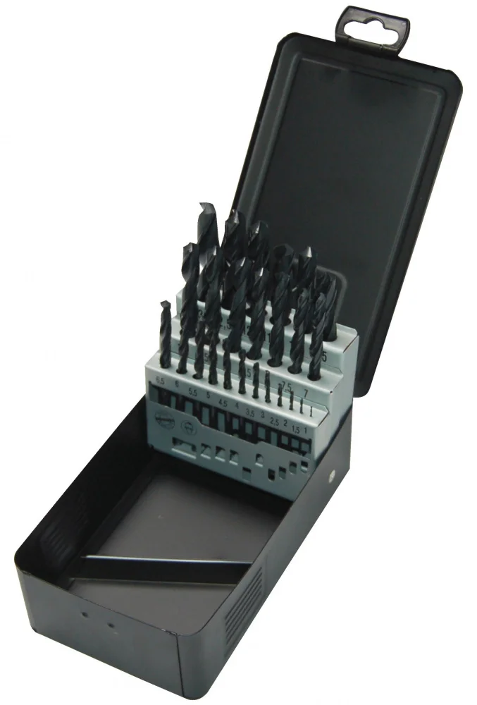 Набір з 25 спіральних свердл охоплює діапазон від 1.0 до 13.0 мм з кроком, оптимальним для більшості робіт по металу. Виготовлені зі швидкорізальної сталі HSS-R з оксидним покриттям, вони призначені для свердління сталі, чавуну та інших металів з межею міцності до 800 Н/мм².