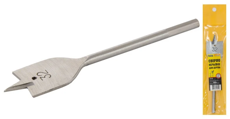 Пір'яне свердло діаметром 32 мм з шестигранним хвостовиком призначене для свердління глибоких та точних отворів у деревині, ДСП, ДВП та м'яких пластиках. Центруючий накінечник забезпечує стабільне положення інструменту на початку роботи, запобігаючи зсуву. Виготовлене з високовуглецевої сталі (HCS) із твердістю 40–42 HRC, свердло зберігає гостроту ріжучої кромки при тривалому використанні.