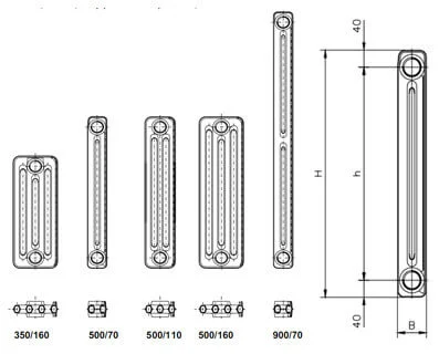 Радіатори стандартно постачаються в батареях по десять секцій, покриті білим водорозчинним ґрунтом. Можливе застосування елегантного нижнього підключення за допомогою інтегрованого термостатичного вентиля. Робочий тиск становить 9 бар, тепловіддача однієї секції — 60.8 Вт, а міжосьова відстань — 500 мм.