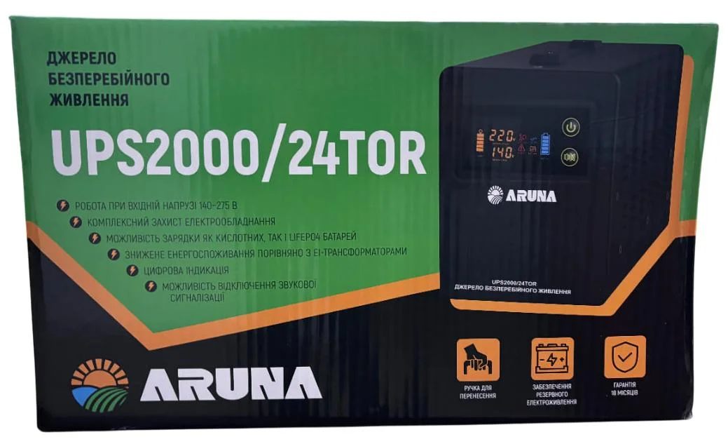 ДБЖ Aruna UPS 2000/24 TOR є надійним рішенням для забезпечення безперебійного живлення та захисту побутової техніки, систем опалення, комп'ютерів та іншого обладнання від нестабільності електромережі. Він підходить для використання в житлових будинках, офісах та інших об'єктах, де потрібна стабільна та якісна електроенергія. Пристрій має ручку для перенесення, що спрощує його експлуатацію. Гарантійний термін обслуговування становить 1.5 роки.