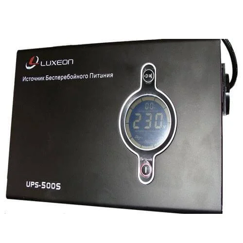 ДБЖ Luxeon UPS-500S живиться від зовнішнього акумулятора 12 В ємністю до 200 А/год, що дозволяє користувачеві самостійно обирати необхідний час автономної роботи. Система автоматично контролює та здійснює підзарядку батареї, забезпечуючи її готовність до роботи. Інформація про стан роботи, рівень заряду акумулятора та навантаження відображається на компактному екрані, доповненому звуковими сповіщеннями для оперативного інформування користувача. Мікропроцесорне управління забезпечує повну автономність та надійність функціонування пристрою.