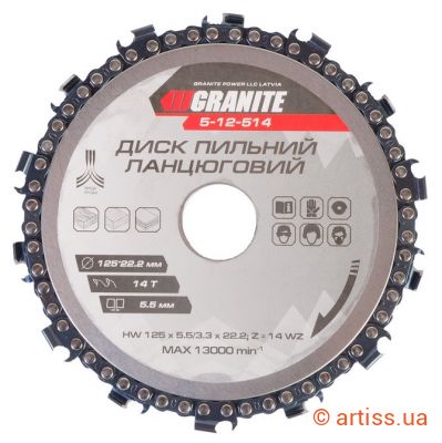 Пильний диск ланцюговий Granite 125x22.2, 14Т (5-12-514) — це надійний інструмент для швидкого та грубого розпилу деревини.