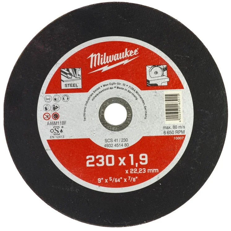 Відрізний диск Milwaukee SCS 41 має діаметр 230 мм і товщину 1,9 мм, що забезпечує підвищену стійкість при роботі. Спеціальна абразивна композиція розроблена для різання сталей, що не містять заліза та сірки.