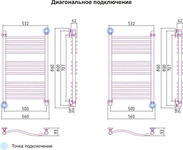 Водяна сушка для рушників виготовлена з нержавіючої сталі, що забезпечує довговічність та стійкість до корозії у вологому середовищі ванної кімнати. Конструкція з нижнім підключенням та міжосьовою відстанню 500 мм дозволяє інтегрувати пристрій у стандартні системи гарячого водопостачання. Тепловиділення моделі становить 497 Вт, що забезпечує ефективне осушання рушників та додатковий обігрів приміщення.