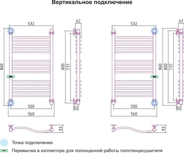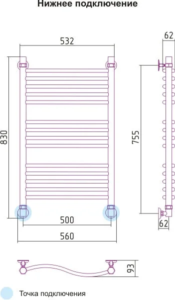 Модель має міжосьову відстань 500 мм, ширину 560 мм та висоту 830 мм, що визначає її габарити для монтажу. Тепловіддача приладу становить 497 Вт, що забезпечує ефективне осушання рушників та підтримання комфортного мікроклімату.