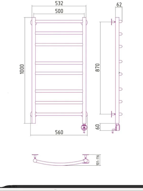 Електричний нагрівний елемент потужністю 300 Вт забезпечує швидкий та рівномірний прогрів усієї конструкції, що дозволяє ефективно сушити рушники та підтримувати комфортну температуру в приміщенні. Модель виготовлена з полірованої нержавіючої сталі, яка стійка до корозії та вологості у ванній кімнаті.