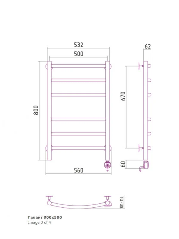 Модель з міжосьовою відстанню 500 мм, загальною висотою 860 мм та шириною 560 мм підходить для стандартних санвузлів. Електричний полотенцесушик Сунержа Галант є практичним рішенням для квартир та будинків, де відсутня централізована система опалення або потрібен додатковий джерело тепла та сушіння.