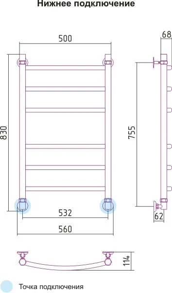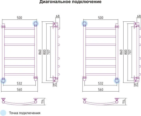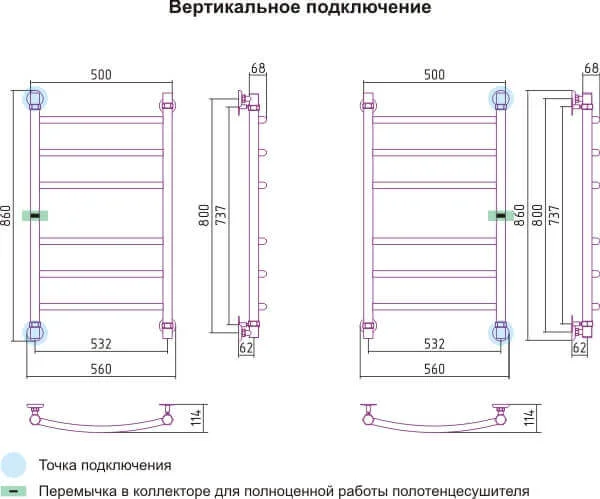 - Універсальне підключення: полотенцосушитель можна підключити як до системи опалення, так і до системи гарячого водопостачання нижнім, діагональним або боковим способом.