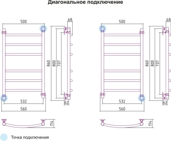 Водяна сушка для рушників виконана з нержавіючої сталі та має розміри 560 мм у ширину та 830 мм у висоту при міжосьовій відстані підключення 500 мм. Конструкція розрахована на робочий тиск до 10 бар та може підключатися до систем опалення або гарячого водопостачання через нижнє підведення з діаметром різьби 1/2".