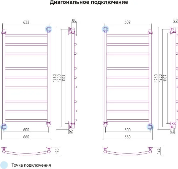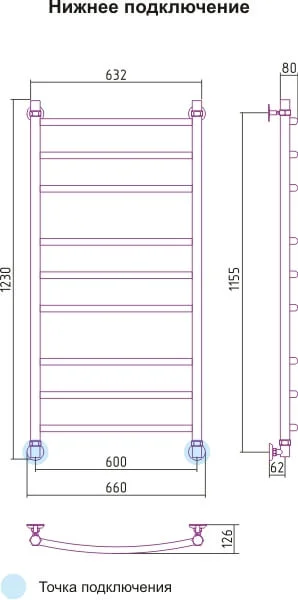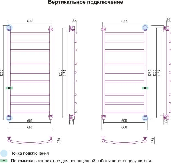 Ця водяна рушникосушка з міжосьовою відстанню 600 мм та габаритами 660x1230 мм призначена для встановлення в ванних кімнатах та санвузлах. Вона підходить для інтеграції в існуючі системи з нижнім підведенням комунікацій.