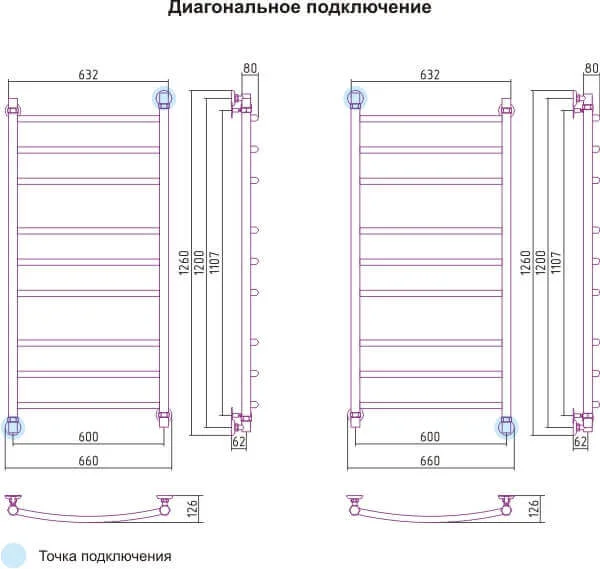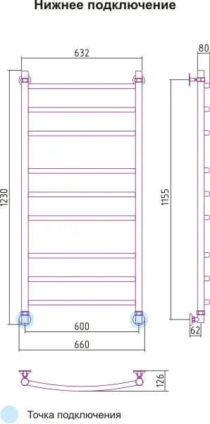 Класична водяна сушка для рушників виконана з нержавіючої сталі зі шліфованою поверхнею. Модель має нижнє підключення діаметром 1/2" та розрахована на роботу в системах гарячого водопостачання або опалення з робочим тиском до 10 бар.