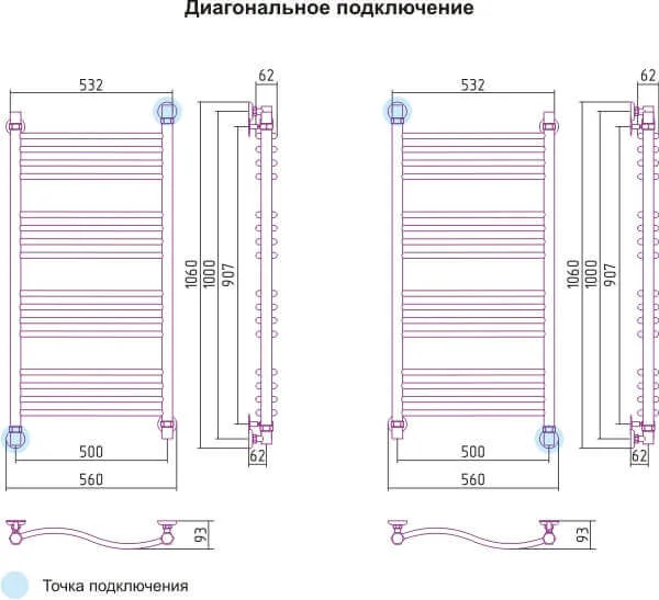 Водяна рушникосушка виготовлена з полірованої нержавіючої сталі та підключається до системи гарячого водопостачання. Модель має нижнє підключення з міжосьовою відстанню 500 мм, робочий тиск становить 10 бар.