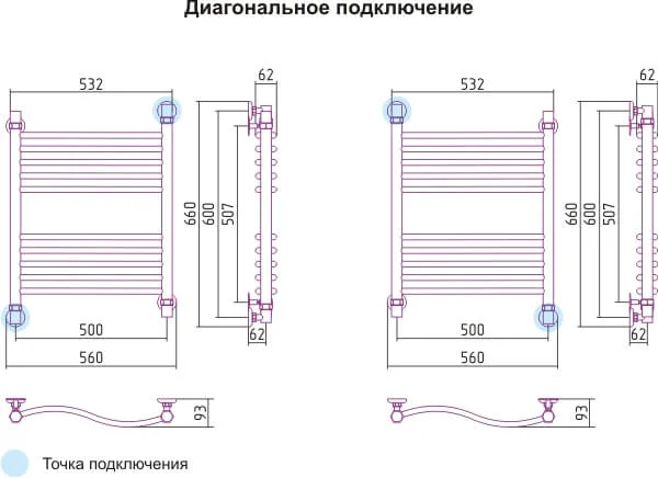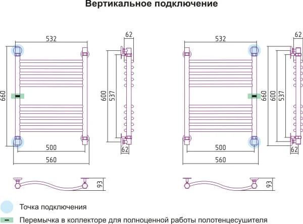 Рушникосушильник з міжосьовою відстанню 500 мм, загальною висотою 630 мм та шириною 560 мм інтегрується у простір ванної кімнати. Він підходить для облаштування приватних квартир або заміських будинків, де потрібен надійний та функціональний елемент сантехніки.