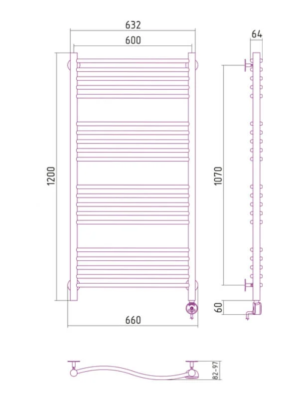Електричний рушникосушник отримує живлення від мережі 220 В і забезпечує тепловіддачу потужністю 300 Вт. Його хвилеподібна конструкція з нержавіючої сталі з покриттям «золото» має міжосьову відстань 600 мм, загальну ширину 660 мм та висоту 1260 мм. Нижнє підключення електроживлення сприяє прихованому прокладанню кабелю та естетичному вигляду після монтажу.