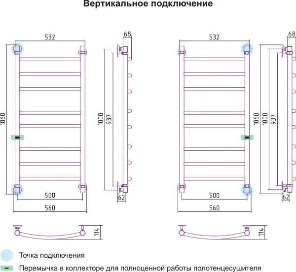 Водяна сушка для рушників виготовлена з нержавіючої сталі шліфованої обробки. Модель має класичну конструкцію з вертикальними стійками та горизонтальними перемичками, що забезпечує ефективне сушіння. Розміри приладу становлять 1030 мм у висоту та 560 мм у ширину при міжосьовій відстані підключення 500 мм.