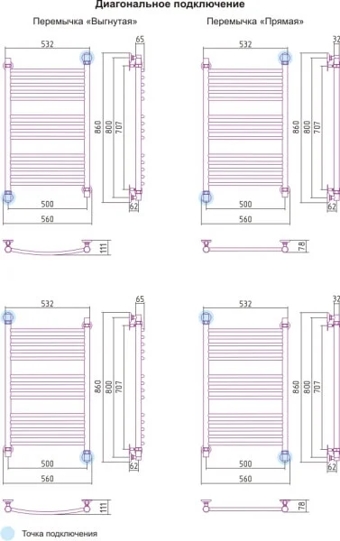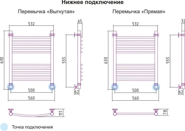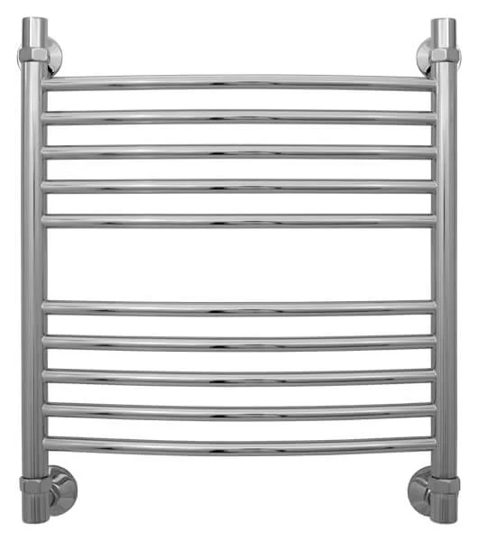 Водяна сушка для рушників виготовлена з полірованої нержавіючої сталі марки Х18Н10Т, що забезпечує корозійну стійкість та довговічність при контакті з вологою. Конструкція моделі має міжосьову відстань 500 мм та загальні габарити приблизно 560x630 мм, що дозволяє ефективно розмістити її в обмеженому просторі. Пристрій розрахований на робочий тиск до 10 бар і підключається за допомогою нижньої підводки з діаметром 1/2".