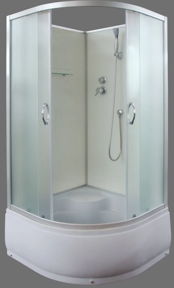 Алюмінієвий профіль з хромованим покриттям забезпечує міцність конструкції, витримуючи до 180 кг у зібраному вигляді. Задні стінки виконані з білого скла, а передні та бічні – з матового, що створює естетичний вигляд та забезпечує приватність. Розсувні двері з двома стулками оснащені подвійними сталевими роликами, що гарантують безшумне та довговічне відкриття/закриття. У комплектацію входить ручний душ, багатофункціональний змішувач, монолітне сидіння, дзеркало, полиці та сифон-автомат.
