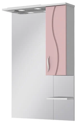 Модель з рожевим фасадом призначена для правостороннього розміщення та підходить для створення яскравого акценту в ванній кімнаті. Дзеркало оптимально для щоденного використання завдяки комбінації освітлення та місця для зберігання.