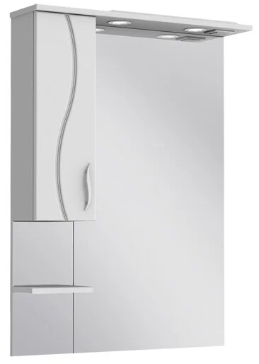 - Функціональний дизайн: лівостороння конфігурація дзеркала з шкафчиком дозволяє ефективно використовувати простір біля умивальника. Внутрішня полиця має отвір для монтажу сифону.