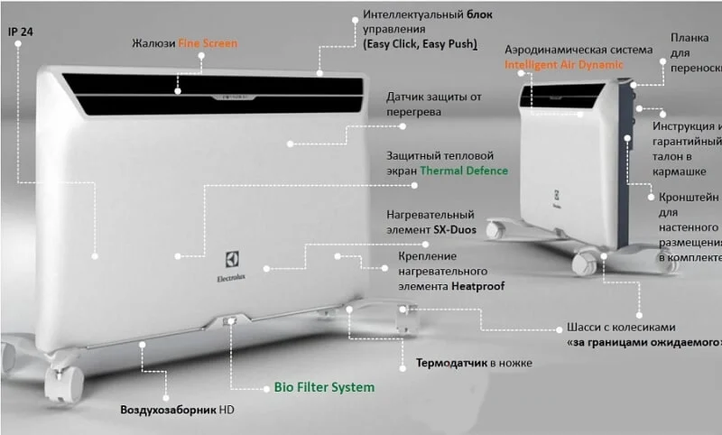 - Високий рівень безпеки: Клас захисту IP24 дозволяє використовувати конвектор у приміщеннях з підвищеною вологістю, а вбудована система термозахисту запобігає перегріву, автоматично вимикаючи прилад. Температура корпусу на лицьовій поверхні не перевищує 50 °С, що робить його безпечним для використання.