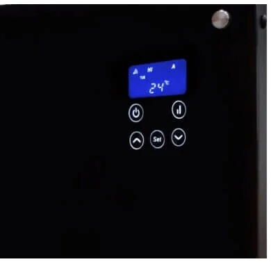 Модель вирізняється елегантним плоским дизайном з передньою панеллю у вигляді «чорного дзеркала», що дозволяє їй гармонійно вписуватися в сучасні інтер'єри. Керування здійснюється за допомогою електронного термостата та сенсорних кнопок на LED-дисплеї, що забезпечує точне налаштування та підтримання бажаної температури в діапазоні від +5 до +35°C. Функція подвійної потужності обігріву (0.75 + 0.75 кВт) дозволяє обирати оптимальний режим роботи для економії електроенергії.