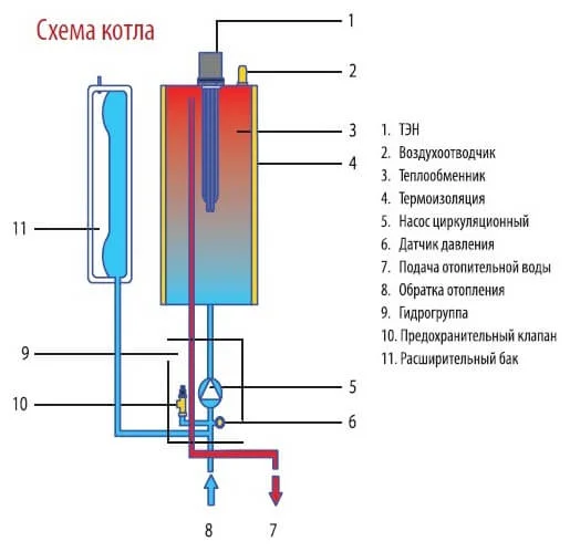 Конструкція котла включає теплообмінник об'ємом 12,8 літра та багатоступеневу систему регулювання потужності, що складається з трьох ТЕНів із сумарною потужністю 15 кВт (3.8 + 3.8 + 7.6 кВт). Така конфігурація дозволяє гнучко адаптувати інтенсивність обігріву до поточних потреб, оптимізуючи споживання електроенергії та запобігаючи роботі на повній потужності в періоди міжсезоння. Вбудований циркуляційний насос забезпечує примусову циркуляцію теплоносія, що сприяє рівномірному розподілу тепла по системі опалення. Котел оснащений електронним блоком управління з можливістю програмування температурних режимів на добу та тиждень, що підвищує комфорт експлуатації та дозволяє додатково економити енергоресурси.