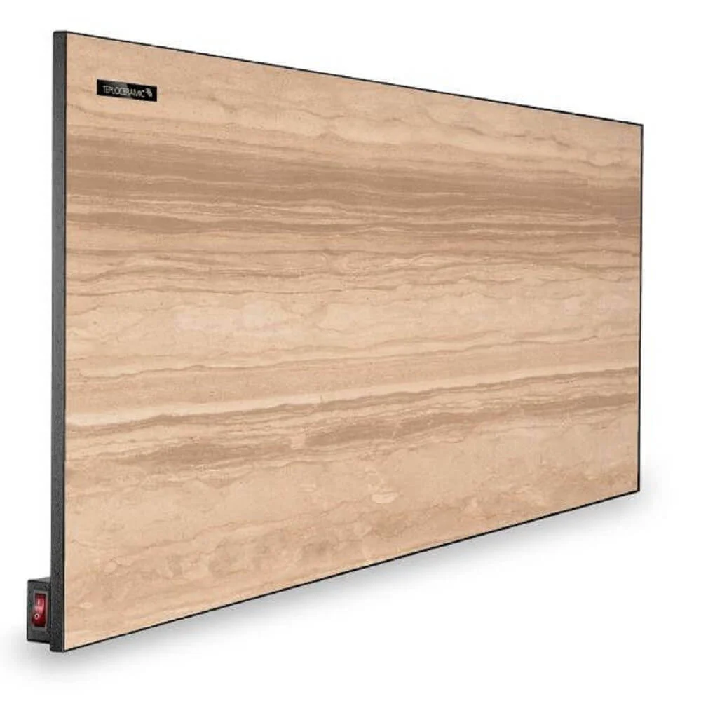 Особливістю конструкції є використання магнезитової плити, яка максимально ефективно передає теплові хвилі через керамічну поверхню, спрямовуючи тепло в приміщення, а не на задню стінку обігрівача. Лицьова сторона панелі, виконана з натурального мармуру, має унікальний візерунок, що додає естетичної привабливості. Пристрій має компактні габарити 600х900х17 мм та вагу 18 кг, що спрощує його інтеграцію в інтер'єр.