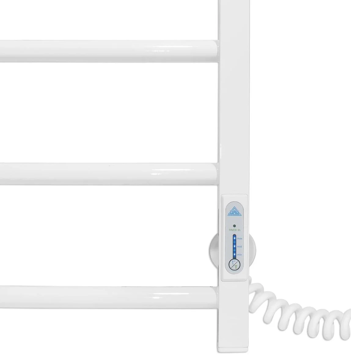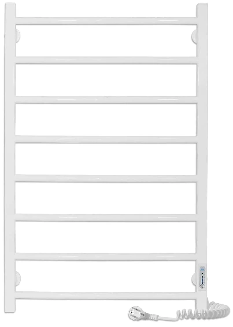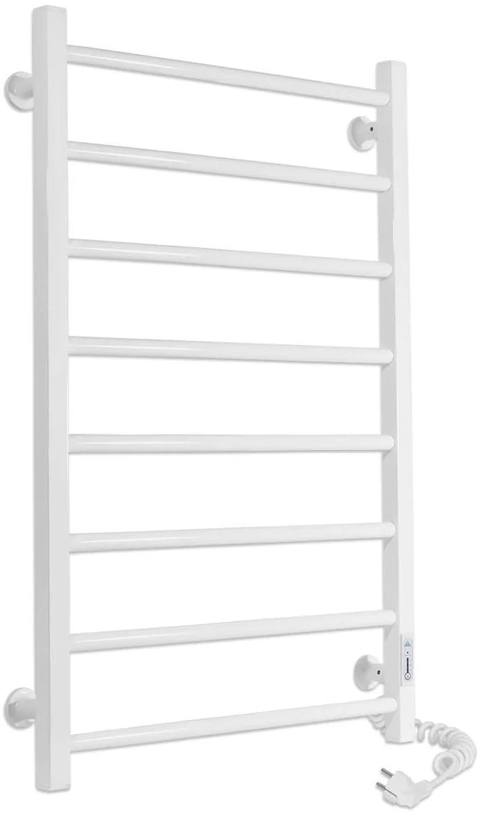 Пристрій працює від мережі 220В 50Гц, підтримуючи температуру поверхні в діапазоні 50±5°C, що є оптимальним для швидкого висихання текстилю без пошкодження волокон. Рушникосушка оснащена програмованим регулятором, розташованим на стійці, який дозволяє налаштовувати режими роботи та температуру. Розміщення шнура живлення можливе як справа, так і зліва, що забезпечує гнучкість при монтажі.