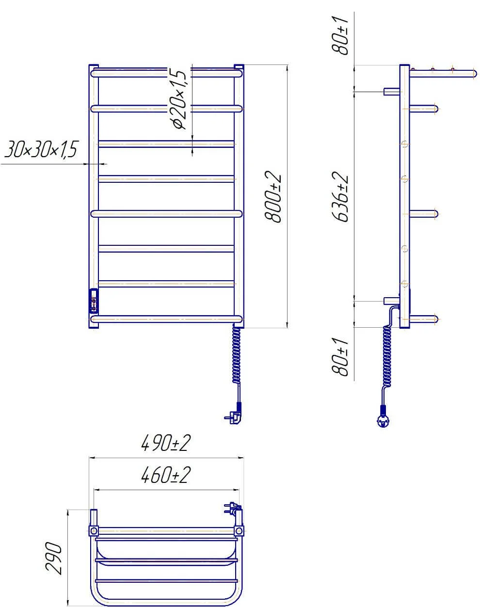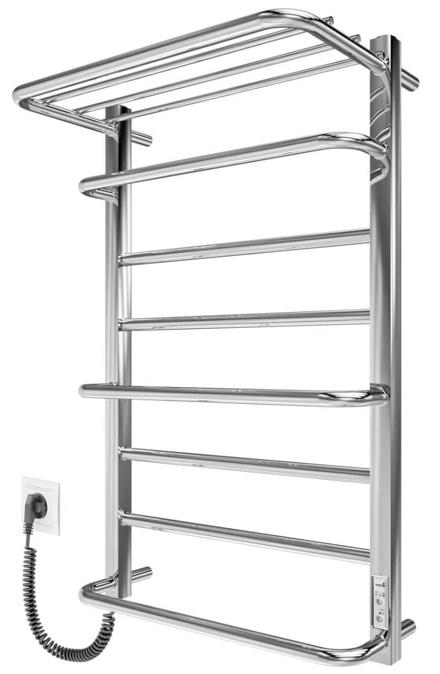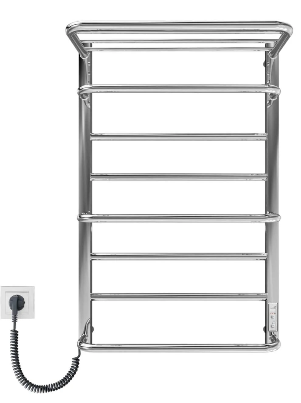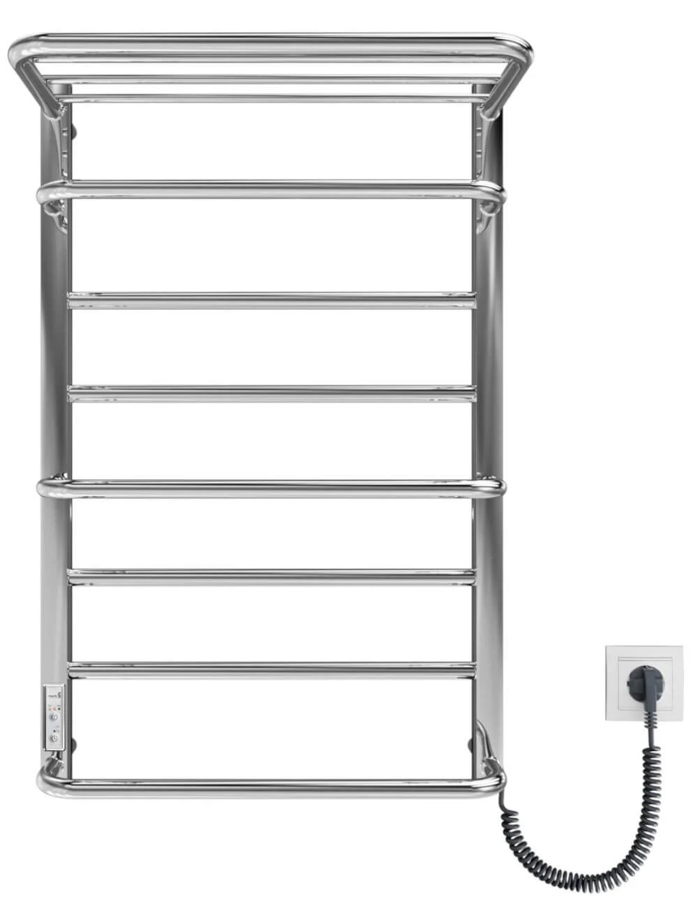 Пристрій оснащений електронним терморегулятором, який дозволяє обирати один з трьох режимів нагріву: 40°С, 45°С або 50°С, забезпечуючи комфортну температуру для сушіння рушників. Вбудований таймер дозволяє встановити час роботи на 3 або 6 годин, а також переключити режим на постійний нагрів. Номінальна потужність полотенцесушителя становить 130 Вт, а його розміри 800x490 мм з 8 ребрами забезпечують ефективне розсіювання тепла. Можливе лівостороннє або правостороннє виконання підключення шнура.