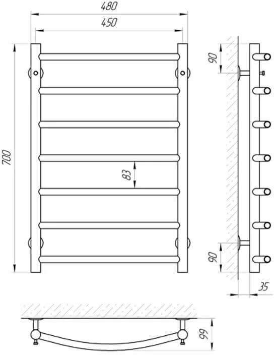 Рушникосушка має тепловіддачу 99 Вт, що сприяє ефективному сушінню рушників та підтриманню комфортного мікроклімату у ванній кімнаті. Міжосьова відстань становить 450 мм. Модель може бути виготовлена з лівостороннім або правостороннім розташуванням шнура живлення, що забезпечує гнучкість при монтажі.