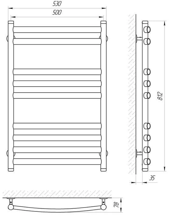 Модель має габаритні розміри 530 мм завширшки та 812 мм заввишки, з міжосьовою відстанню 500 мм, що дозволяє сушити як дрібні речі, так і великі халати. Тепловіддача рушникосушки становить 140 Вт, що забезпечує швидке та якісне висушування. Для зручності використання передбачено механічний терморегулятор. Виріб може бути виготовлений як у лівосторонньому, так і у правосторонньому виконанні (розташування шнура), а також доступне замовлення з додатковим покриттям під золото або бронзу для інтеграції в різні інтер'єрні рішення.