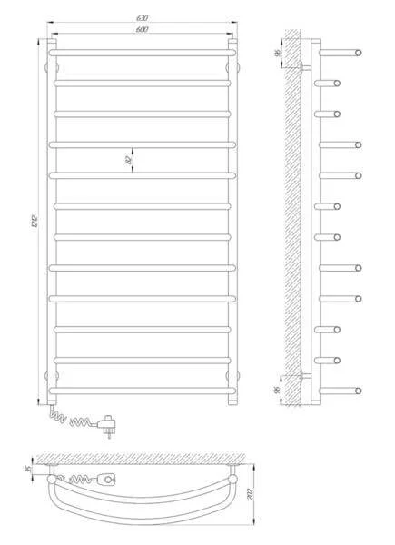 Конструкція рушникосушки включає стійки діаметром 30 мм та перемички діаметром 20 мм з товщиною стінок 1.5 мм та 1.2 мм відповідно, що забезпечує міцність та надійність виробу. Загальні габарити 600 х 1200 мм дозволяють розмістити значну кількість рушників, а теплова потужність 235 Вт сприяє швидкому та рівномірному обігріву. Механічний регулятор, розташований на вилці, спрощує керування пристроєм, дозволяючи легко вмикати та вимикати його.