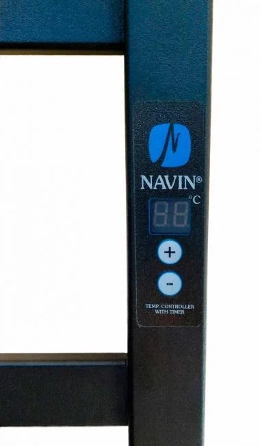 Модель виготовлена українським виробником NAVIN з високоякісної вуглецевої сталі, що забезпечує її міцність та довговічність. Поверхня рушникосушки має порошкове покриття чорного муарового кольору, яке стійке до зовнішніх впливів та легко очищається. Товщина стінки перемичок становить 1,5 мм, а стійок – 2 мм, що підкреслює надійність конструкції. Пристрій оснащений електронним терморегулятором, що дозволяє точно контролювати температуру нагріву. Загальні розміри рушникосушки складають 815 мм у висоту та 482 мм у ширину, з міжосьовою відстанню 450 мм.