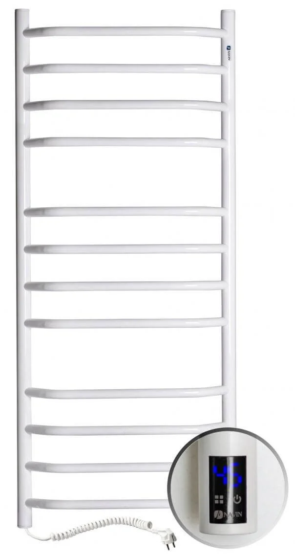Електрична рушникосушка Navin Блюз, виконана у формі драбинки, призначена для ефективного обігріву ванних кімнат, сушіння рушників та білизни. Завдяки своїй конструкції та живленню від електромережі, вона забезпечує незалежність від системи гарячого водопостачання, дозволяючи встановлення у будь-якому зручному місці.
