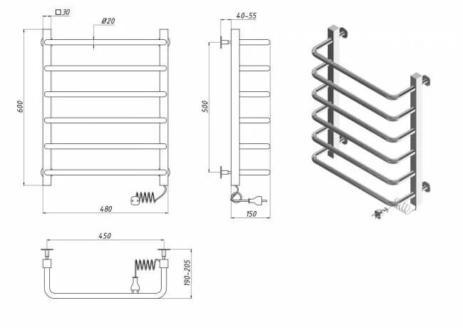 Конструкція рушникосушки виконана у формі драбини, що дозволяє зручно розміщувати рушники для сушіння. Виготовлена з емальованої сталі, що забезпечує стійкість до корозії та довговічність в умовах підвищеної вологості. Рушникосушка має висоту 615 мм та ширину 482 мм, з міжосьовою відстанню 450 мм. Теплова потужність становить 72 Вт, що свідчить про низьке споживання електроенергії. Можливість встановлення терморегулятора (опція) дозволяє оптимізувати витрати енергії та підтримувати бажану температуру. Завдяки електричному живленню, рушникосушку можна розмістити на будь-якій стіні у ванній кімнаті, на кухні або в передпокої.
